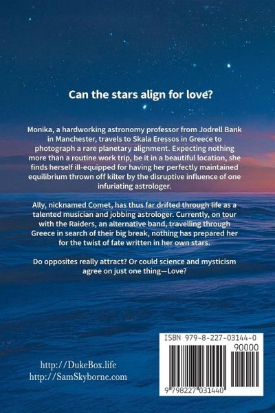 Can the stars align for love? Monika, a hardworking astronomy professor from Jodrell Bank in Manchester, travels to Skala Eressos in Greece to photograph a rare planetary alignment. Expecting nothing more than a routine work trip, be it in a beautiful location, she finds herself ill-equipped for having her perfectly maintained equilibrium thrown off kilter by the disruptive influence of one infuriating astrologer. Ally, nicknamed Comet, has thus far drifted through life as a talented musician and jobbing astrologer. Currently, on tour with the Raiders, an alternative band, travelling through…mehr