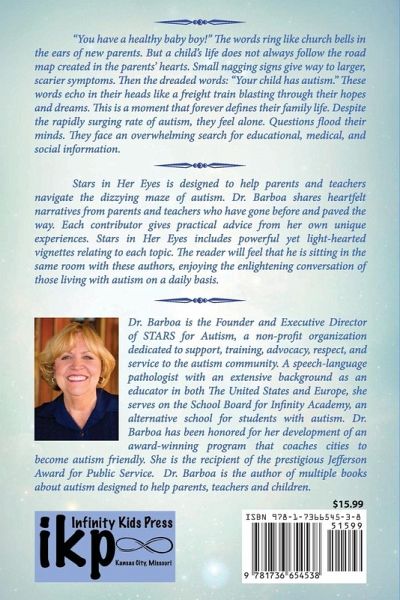 "You have a healthy baby boy!" The words ring like church bells in the ears of new parents. But a child's life does not always follow the road map created in the parents' hearts. Small nagging signs give way to larger, scarier symptoms. Then the dreaded words: "Your child has autism." These words echo in their heads like a freight train blasting through their hopes and dreams. This is a moment that forever defines their family life. Despite the rapidly surging rate of autism, they feel alone. Questions flood their minds. They face an overwhelming search for educational, medical, and social information. Stars in Her Eyes is designed to help parents and teachers navigate the dizzying maze of autism. Dr. Barboa shares heartfelt narratives from parents and teachers who have gone before and paved the way. Each contributor gives practical advice from her own unique experiences. Stars in Her Eyes includes powerful yet light-hearted vignettes relating to each topic. The reader will feel that he is sitting in the same room with these authors, enjoying the enlightening conversation of those living with autism on a daily basis.