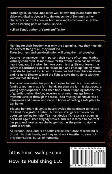 Fighting for their freedom was only the beginning, now they must do the hardest thing of all, they must live. Three journeys and one destination will bring them all together. Despite having never met in person, their years of communicating virtually cemented Eleanor's love for the woman who has her whole heart long ago. But when her love goes missing, Eleanor leaves the safety of Sandstone Estate to rescue her, and ends up finding more than she bargained for. An entire town has had their children stolen, and it's up to Eleanor to lead the fight to save them, along with the woman that she loves. Theo can't remember his past, but begins to build his future when a family takes him in as a farm hand. But then the farm is destroyed, a young boy is orphaned, and Theo finds himself slipping into the role of guardian. When the boy receives an urgent message from a mysterious voice through the radio, Theo must guide him across a dangerous and barren landscape in hopes of finding a safe place to call home. Téa and her infant daughter have traveled the continent to restore the land for a grateful nation, but when strangers arrive on her doorstep looking for help, Téa must decide if she can risk opening her heart again. Then tragedy strikes, and Téa is forced to confront her past and meet a new challenge that has the power to rip the Earth to shreds. As Eleanor, Theo, and Téa's paths collide, the future of mankind is thrust into their hands, and they must work together to save not only themselves, but all of humanity.