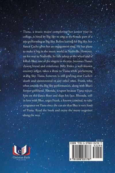 Tiana, a music major completing her junior year in college, is hired by Big Sky to sing as the female part of a trio performing at Big Sky. Before leaving for Big Sky, her fiancé Cache gives her an engagement ring. He has plans to make it big in the music world in Nashville. However, on his way to Nashville, he falls asleep at the wheel and is killed. Blue, one of the singers in the trio, becomes Tiana's closest friend and comforter. Billy Rider, a well-known country singer, takes a shine to Tiana while performing at Big Sky. Tiana, however, is still grieving over Cache's death and uninterested in any other man. Frank, who often attends the Big Sky performances, along with Blue's former girlfriend, Rhonda, is upset because Tiana rejects him on the dance floor and slaps his face. Rhonda, still in love with Blue, urges Frank, a known criminal, to take vengeance on Tiana since she can see that Blue is very fond of Tiana. Read the book and enjoy the many surprises along the way.