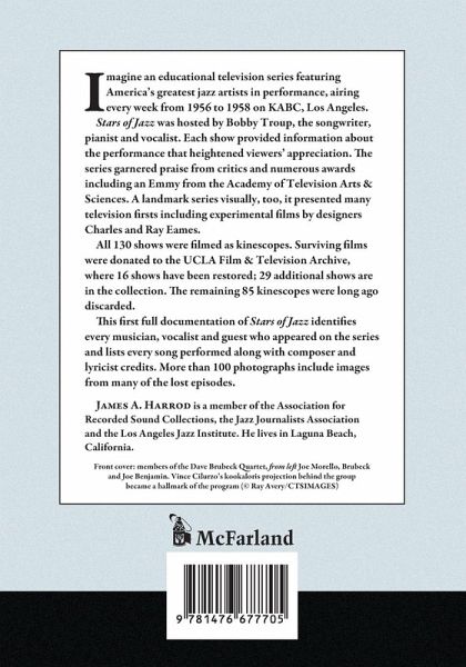 Imagine an educational television series featuring America's greatest jazz artists in performance, airing every week from 1956 to 1958 on KABC, Los Angeles. Stars of Jazz was hosted by Bobby Troup, the songwriter, pianist and vocalist. Each show provided information about the performance that heightened viewers' appreciation. The series garnered praise from critics and numerous awards including an Emmy from the Academy of Television Arts & Sciences. A landmark series visually, too, it presented many television firsts including experimental films by designers Charles and Ray Eames. All 130 shows were filmed as kinescopes. Surviving films were donated to the UCLA Film & Television Archive, where 16 shows have been restored; 29 additional shows are in the collection. The remaining 85 kinescopes were long ago discarded. This first full documentation of Stars of Jazz identifies every musician, vocalist, and guest who appeared on the series and lists every song performed on the series along with composer and lyricist credits. More than 100 photographs include images from many of the lost episodes.
