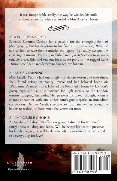 FINALIST - 2025 HOLT MEDALLION, 2025 MAGGIE AWARD FOR EXCELLENCE It was irresponsible, really, the way he wielded his smile without a care for where it landed. - Miss Amelia Thorne A GENTLEMAN'S TASK Scientist Edmund Corbyn has a passion for the emerging field of photography, but his devotion to his family is unwavering. When it falls to him to save their centuries-old legacy, he readily accepts the challenge. Entrusted by his grandfather and Queen Victoria to secure a suitable bride, Edmund sets out for a house party in the rugged Lake District, confident and determined to achieve his aim. A LADY'S YEARNING Miss Amelia Thorne had one single, scandalous season and ever since, she's found refuge in poetry, music and her beloved home on Windermere's misty shore. Labeled the Poisoned Thorne by London's gossip rags, she has little patience for high society or the London tourists tramping her paths. Her peace is disrupted, though, when a chance encounter with one of her aunt's guests sparks an immediate connection. Despite Amelia's resolve to maintain her seclusion, she begins to realize just how much she yearns for more. AN IMPOSSIBLE CHOICE As Amelia and Edmund's affection grows, Edmund finds himself caught between duty and desire. Will he betray his heart to preserve his family's legacy, or will he dare to defy his monarch's mandate and risk everything for love? Stars of Twilight Fair is a witty, humorous and tender forbidden-love romance set in the majestic Lake District. It features a bookish heroine, a scientist hero, a few bits of poetry (both good and bad) and a dog named Lord Byron. If you believe the scent of bookshop is "as rich as the most decadent perfume," then you are a reader after Amelia's own heart. This is a full-length novel and the third in the Love's Journey series. Each book stands alone, but many readers prefer to enjoy them in order.