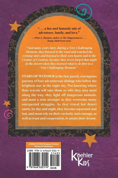 "And many years later, during a Very Challenging Moment, they listened to the wind and watched the evening stars and listened to their own hearts and to the Creator of Creation, because they never forgot that night in the desert when they learned what to do first in aVery Challenging Moment." STARS Of WONDER is the fast-paced, courageous journey of four adventurous siblings who follow the brightest star in the night sky. Not knowing where their travels will take them or who they may meet along the way, they fight off dangerous animals, and meet a wise stranger as they overcome many unexpected struggles. As they travel hot desert sands, by day and night, they become separated and lost, and must rely on their curiosity and courage, as well as trust and cooperation, to attain their dream.