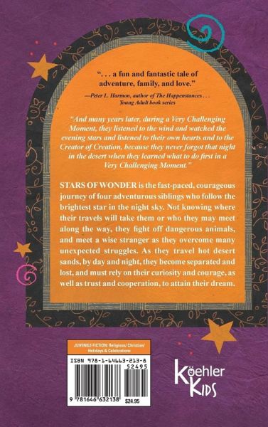 "And many years later, during a Very Challenging Moment, they listened to the wind and watched the evening stars and listened to their own hearts and to the Creator of Creation, because they never forgot that night in the desert when they learned what to do first in aVery Challenging Moment." STARS Of WONDER is the fast-paced, courageous journey of four adventurous siblings who follow the brightest star in the night sky. Not knowing where their travels will take them or who they may meet along the way, they fight off dangerous animals, and meet a wise stranger as they overcome many unexpected struggles. As they travel hot desert sands, by day and night, they become separated and lost, and must rely on their curiosity and courage, as well as trust and cooperation, to attain their dream.