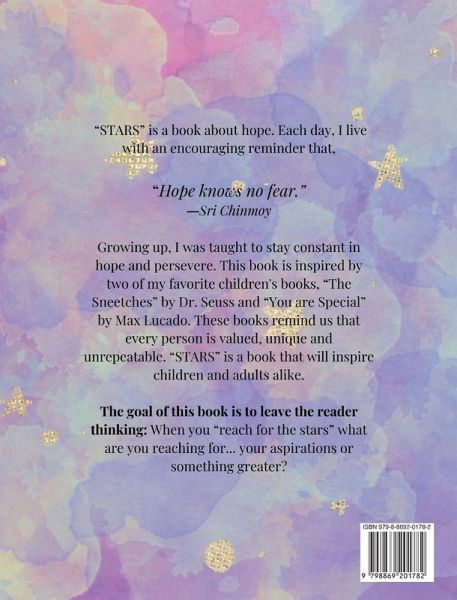 "STARS" is a book about hope. Each day, I live with an encouraging reminder that, "Hope knows no fear." ¿Sri Chinmoy Growing up, I was taught to stay constant in hope and persevere. This book is inspired by two of my favorite children's books, "The Sneetches" by Dr. Seuss and "You are Special" by Max Lucado. These books remind us that every person is valued, unique and unrepeatable. "STARS" is a book that will inspire children and adults alike. The goal of this book is to leave the reader thinking: When you "reach for the stars" what are you reaching for... your aspirations or something greater?