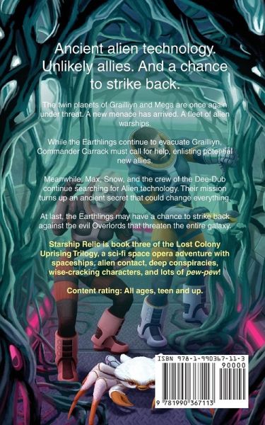Ancient alien technology. Unlikely allies. And a chance to strike back. The twin planets of Grailliyn and Mega are once again under threat. A new menace has arrived. A fleet of alien warships. While the Earthlings continue to evacuate Grailliyn, Commander Carrack must call for help, enlisting potential new allies. Meanwhile, Max, Snow, and the crew of the Dee-Dub continue searching for Alien technology. Their mission turns up an ancient secret that could change everything. At last, the Earthlings may have a chance to strike back against the evil Overlords that threaten the entire galaxy. Starship Overlords is book three of the Lost Colony Uprising Trilogy, a sci-fi space opera adventure with spaceships, alien contact, deep conspiracies, wise-cracking characters, and lots of pew-pew (space battle action). Content rating: All ages, teen and up. Minimal language.