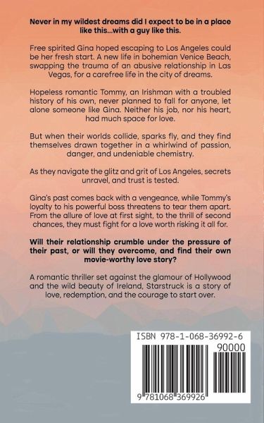 Never in my wildest dreams did I expect to be in a place like this...with a guy like this. Free spirited Gina hoped escaping to Los Angeles could be her fresh start. A new life in bohemian Venice Beach, swapping the trauma of an abusive relationship in Las Vegas, for a carefree life in the city of dreams. Hopeless romantic Tommy, an Irishman with a troubled history of his own, never planned to fall for anyone, let alone someone like Gina. Neither his job, nor his heart, had much space for love. But when their worlds collide, sparks fly, and they find themselves drawn together in a whirlwind of passion, danger, and undeniable chemistry. As they navigate the glitz and grit of Los Angeles, secrets unravel, and trust is tested. Gina's past comes back with a vengeance, while Tommy's loyalty to his powerful boss threatens to tear them apart. From the allure of love at first sight, to the thrill of second chances, they must fight for a love worth risking it all for. Will their relationship crumble under the pressure of their past, or will they overcome, and find their own movie-worthy love story? A romantic thriller set against the glamour of Hollywood and the wild beauty of Ireland, Starstruck is a story of love, redemption, and the courage to start over.