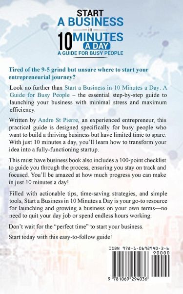 Tired of the 9-5 grind but unsure where to start your entrepreneurial journey? Look no further than Start a Business in 10 Minutes a Day: A Guide for Busy People - the essential step-by-step guide to launching your business with minimal stress and maximum efficiency. With just 10 minutes a day, you'll learn how to transform your idea into a fully-functioning startup including: Prepare for your business journey with clarity and confidence, even if you're a complete beginner Craft a solid business plan in minutes-no complicated spreadsheets or jargon, just the essentials to get you started Build and market your business with low-cost, high-impact strategies that get results fast Manage and grow your business effectively without feeling overwhelmed by day-to-day tasks Launch your business with confidence and take the first steps toward long-term success This must have business book also includes a 100-point checklist to guide you through the process, ensuring you stay on track and focused. You'll be amazed at how much progress you can make in just 10 minutes a day!