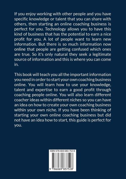 Start a Coaching Business Online: The Ultimate Guide on How to Start an Online Coaching Business, Learn How You Can Use Your Knowledge, Talent and Expertise to Start a Successful Coaching Business If you enjoy working with other people and you have specific knowledge or talent that you can share with others, then starting an online coaching business is perfect for you. Technology allows you to have this kind of business that has the potential to earn a nice profit for you. A lot of people want to learn new information. But there is so much information now online that people are getting confused about which ones are true. So it's only natural they seek a legitimate source of information and this is where you can come in. This book will teach you all the important information you need in order to start your own coaching business online. You will learn how to use your knowledge, talent, and expertise to earn a good profit through coaching people online. You will also learn different coacher ideas within different niches so you can have an idea on how to create your own coaching business within your own niche. This book will discuss the following topics: Types of Coaching Businesses How to Implement Your Coaching Business Resources and Example Coaching Business Marketing Your Coaching Business Making Your Business Fun and Engaging Find Out What People Want and Need As with any other business, your online coaching business would require time and effort for it to flourish. After all, one of the ways success is measured is from the amount of work that's been put into it. If you have been thinking of starting your own online coaching business but did not have an idea how to start, this guide is perfect for you. Scroll up and click "add to cart" now.