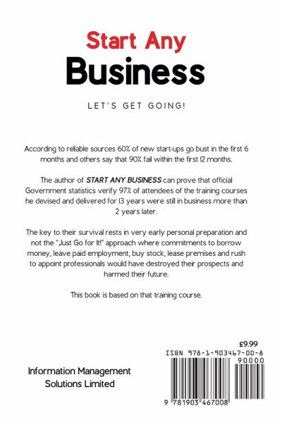 According to reliable sources 60% of new start-ups go bust in the first 6 months and others say that 90% fail within the first 12 months. The author of START ANY BUSINESS can prove that official Government statistics verify 97% of attendees of the training courses he devised and delivered for 13 years were still in business more than 2 years later. Key to their survival rests in very early personal preparation and not the "Just Go for It!" approach where commitments to borrow money, leave paid employment, buy stock, lease premises and rush to appoint professionals would have destroyed their prospects and harmed their future. This book is based on that training course, which he delivered to more than 2,250 aspiring entrepreneurs. It is a practical and straightforward guide to starting any small business. Importantly, the book will help you decide if being in business is right for you. START ANY BUSINESS is constructed in a modular style so that you can dip in and out of sections as you need them and will lead you through the process of producing your own business plan.
