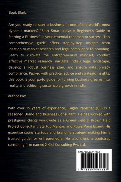 **Book Description: ** Are you ready to start a business in one of the world's most vibrant markets? "Start Smart India: A Beginner's Guide to Starting a Business" is your essential roadmap to success. Discover how to: - Cultivate the entrepreneurial mindset with creativity, resilience, and adaptability. - Conduct effective market research and identify your target audience. - Navigate India's legal and regulatory frameworks crucial for business success. - Develop a robust business plan and secure the necessary funding. - Ensure data privacy compliance to safeguard personal data and build customer trust. With practical advice, real-world examples, and strategic insights, "Start Smart India" equips you with the tools and knowledge needed to thrive in today's competitive landscape. Whether driven by passion, a desire to solve problems, or the ambition to innovate, this book empowers you to turn your business dreams into reality. Embrace this opportunity to invest in your entrepreneurial journey and position your business for sustainable growth and success in the Indian market. Packed with actionable strategies and expert guidance, "Start Smart India" is your go-to guide for making your mark in the world of business. Embark on your entrepreneurial journey today with "Start Smart India," and pave your way to achieving entrepreneurial greatness.