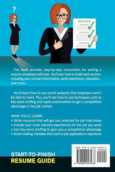 An amazing resume is the first step in getting the job you want. Many employers require that you submit a resume with your initial application, and they use that resume to decide if you make it through their initial screening process. That's why getting your resume right is so important. This book provides step-by-step instructions for writing a winning resume. You'll see how to build each section including your contact information, work experience, education, and more. You'll also learn how to use secret weapons that employers won't be able to resist, and you'll see how to use techniques such as key word stuffing and resume customization to have a competitive advantage in the job market. This book explains what you'll need to know about the hiring process, as well as how to write resumes and cover letters that will get you selected for job interviews. Topics include the following: - How to get through the ATS screening software that most employers use - How to write a resume that will appeal to both computers and humans - How to include the most relevant key words on your resumes - How to craft cover letters so employers will see you as the best choice for the job - How to customize your resumes and cover letters to match each job opportunity WHAT LEVEL IS THE MATERIAL COVERED IN THIS BOOK: - Beginner to Intermediate level - For people who have limited experience writing resumes and cover letters WHAT YOU'LL LEARN: - Write resumes that will get you selected for job interviews - Use key word stuffing techniques to give your resume a competitive advantage - Write cover letters that employers will love - Identify and leverage relevant experiences to feature on your resume - Avoid making mistakes that lead to your job applications being rejected