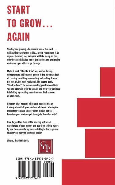 Starting and growing a business is one of the most exhilarating experiences in life...I would recommend it to anyone! However, not everyone will take me up on the offer because it is also one of the hardest and challenging endeavours you will ever go through. My first book Start to Grow was written to help entrepreneurs and business owners in the herculean task of creating something from nothing and making it work, not just ok, but work really well. The second book, Start to Lead, focuses on creating great leadership in you and others in order to sustain and grow your business indefinitely by creating an environment that achieves all your goals. However, what happens when your business hits an iceberg, when it all goes south or whatever catastrophic metaphors you care to use? When a crisis comes - how does your business get through to the other side? How do you then take all the amazing and brutal experiences of your journey and use them to help others by one to one mentoring or even taking to the stage and sharing your story to the wider world? Simple. Read this book.