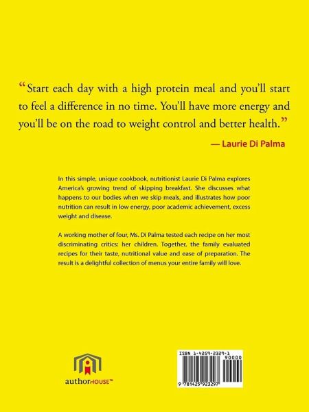 "Start each day with a high protein meal and you'll start to feel a difference in no time. You'll have more energy and you'll be on the road to weight control and better health." Laurie Di Palma In this simple, unique cookbook, nutritionist Laurie Di Palma explores America's nationwide trend of skipping breakfast. She discusses what happens to our bodies when we skip meals, and illustrates the connection between poor nutrition and low energy, poor academic achievement, excess weight, and disease. A working mother of four, Ms. Di Palma tested each recipe on her most discriminating critics: her children. Together, the family evaluated recipes for their taste, nutritional value and ease of preparation. The result is a delightful collection of menus your entire family will love.