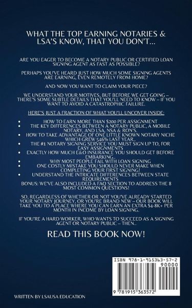 What the top earning notaries & LSA's know, that you don't... Are you eager to become a notary public or certified loan signing agent as fast as possible? Perhaps you've heard just how much some signing agents are earning, even remotely from home? And now you want to claim your piece? We understand your motives, but before we get going - there's some subtle details that you'll need to know - if you want to avoid a catastrophic failure. Here's just a fraction of what you'll uncover inside: * How to earn more than $200 per assignment * The key differences between a notary public, LSA, NSA & RON? * How to take advantage of one little known notary niche which grew 546% last year.. * The #1 notary network you MUST sign up to, for easy assignments * Exactly how much E&O insurance you should get before embarking.. * Why MOST people fail with loan signing * One costly mistake you should NEVER make when completing your first signing! * Understand the intricate differences between state requirements BONUS: We've also included a FAQ section to address the 8 most common questions! So, regardless of whether or not you've already started your notary journey, or you're brand new - our book will take you to a place where you can earn an extra $4-8K per month by loan signing. If you're a hard worker, who wants to succeed as a signing agent or notary public - then.. Scroll up and click "Add to Cart" now!