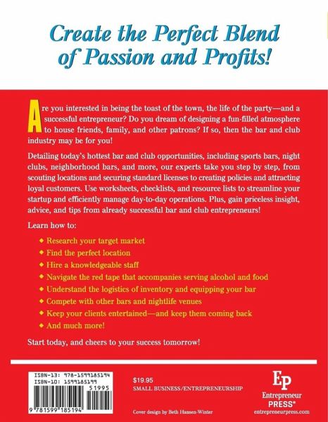 An updated edition of the fifth best-selling book of the successful Startup Series, Start Your Own Bar and Club is a comprehensive guide that shows aspiring entrepreneurs how to create the perfect blend of passion and profits within the bar industry. Updated with the latest industry trends, news, and resources, readers learn about the hottest bar and club opportunities including sports bars, night clubs, neighborhood bars, wine bars, and more. The experts at Entrepreneur take aspiring business owners step-by-step through start-up basics including scouting locations, researching their market, and licensing requirements. Eager entrepreneurs learn first-hand from industry experts how to research their market, design an attractive atmosphere, create policies and procedures, woo their patrons and keep them coming back. Also covered is the latest equipment such as new cash register systems and HDTVs, and expanded information on the Special Occupancy Tax, liquor liability insurance, and third-party liability insurance.
