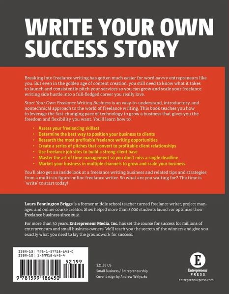 Write Your Own Success Story Breaking into freelance writing has gotten much easier for word-savvy entrepreneurs like you. But even in the golden age of content creation, you still need to know what it takes to launch and consistently pitch your services so you can grow and scale your freelance writing side hustle into a full-fledged career you really love. Start Your Own Freelance Writing Business is an easy-to-understand, introductory, and nontechnical approach to the world of freelance writing. This book teaches you how to leverage the fast-changing pace of technology to grow a business that gives you the freedom and flexibility you want. You'll learn how to: * Assess your freelancing skillset * Determine the best way to position your business to clients * Research the most profitable freelance writing opportunities * Create a series of pitches that convert to profitable client relationships * Use freelance job sites to build a strong client base * Master the art of time management so you don't miss a single deadline * Market your business in multiple channels to grow and scale your business You'll also get an inside look at a freelance writing business and related tips and strategies from a multi-six figure online freelance writer. So what are you waiting for? The time is "write" to start today! About the Author Laura Pennington Briggs is a former middle school teacher turned freelance writer, project manager, and online course creator. She's helped more than 8,000 students launch or optimize their freelance business since 2012. For more than 30 years, Entrepreneur Media, Inc. has set the course for success for millions of entrepreneurs and small business owners. We'll teach you the secrets of the winners and give you exactly what you need to lay the groundwork for success.