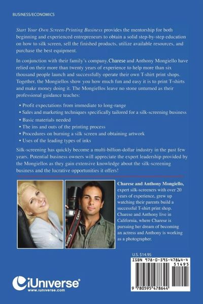 Start Your Own Screen-Printing Business provides the mentorship for both beginning and experienced entrepreneurs to obtain a solid step-by-step education on how to silk screen, sell the finished products, utilize available resources, and purchase the best equipment. In conjunction with their family's company, Charese and Anthony Mongiello have relied on their more than twenty years of experience to help more than six thousand people launch and successfully operate their own T-shirt print shops. Together, the Mongiellos show you how much fun and easy it is to print T-shirts and make money doing it. The Mongiellos leave no stone unturned as their professional guidance teaches: Profit expectations from immediate to long-range Sales and marketing techniques specifically tailored for a silk-screening business Basic materials needed The ins and outs of the printing process Procedures on burning a silk screen and obtaining artwork Uses of the leading types of inks Silk-screening has quickly become a multi-billion-dollar industry in the past few years. Potential business owners will appreciate the expert leadership provided by the Mongiellos as they gain extensive knowledge about the silk-screening business and the lucrative opportunities it offers!