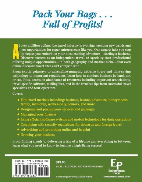 Pack Your Bags...Full of Profits! At over a billion dollars, the travel industry is evolving, creating new trends and new opportunities for eager entrepreneurs like you. Our experts take you step by step as you embark on your most exciting adventure--starting a business. Discover success as an independent travel or specialty tour professional offering unique opportunities--in both geography and market niche--that even online discount travel sites can't compete with. From exotic getaways to adrenaline-pumping extreme tours and time-saving technology to important regulations, learn how to conduct business by land, air, or sea. Plus, access an abundance of resources including important associations, travel-specific software, mailing lists, and in-the-trenches tips from successful travel specialists and tour operators. Covers: * Hot travel markets including: business, leisure, adventure, honeymoons, family, men only, women only, seniors, and more * Designing and pricing your services and packages * Managing your finances * Using efficient software systems and mobile technology for daily operations * Complying with security regulations for domestic and foreign travel * Advertising and promoting online and in print * Growing your business From finding clients to delivering a trip of a lifetime and everything in between, learn what you need to know to become a high-flying success!