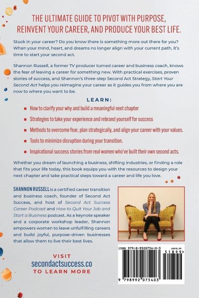 The ultimate guide to pivot with purpose, reinvent your career, and produce your best life. The career that once inspired you no longer fits your life, and a nagging voice inside tells you there's something more. When your mind, heart, and dreams no longer align with your current path, it's time to start your second act. Shannon Russell, a former TV producer turned entrepreneur and career/business coach, understands the fears and challenges of disrupting your carefully planned career and taking the leap into something more. Drawing on her personal experiences and the success stories of other women, she shares her proven three-step Second Act Strategy (reflect, research, realize) to guide you from where you are now to where you want to be. Start Your Second Act is a strategic, actionable guide to taking your past experience and using it to build a career or a business that fulfills you. With practical exercises, the powerful YouMap assessment, and self-empowerment insights, this book helps you reimagine your career and build a second act that works for both you and your family. What you'll learn:How to clarify your why and use it as a foundation for your next chapter. Strategies to rebrand yourself for success, whether changing careers or launching a business. Methods to overcome fear, plan strategically, and align your career change with your values and goals. Tools to prepare for transitions while minimizing financial and personal disruption. Inspirational success stories from real women who've built their own second acts. This isn't about taking blind risks-it's about making thoughtful, strategic decisions that align with your life priorities. More than just a career guide, Start Your Second Act challenges you to rethink what's possible and start on a professional growth journey that's as fulfilling as it is purposeful. Whether you dream of starting a business, changing industries, or finding a role that fits your life today, this book gives you the tools to design your next chapter and create a career-and life-you love.