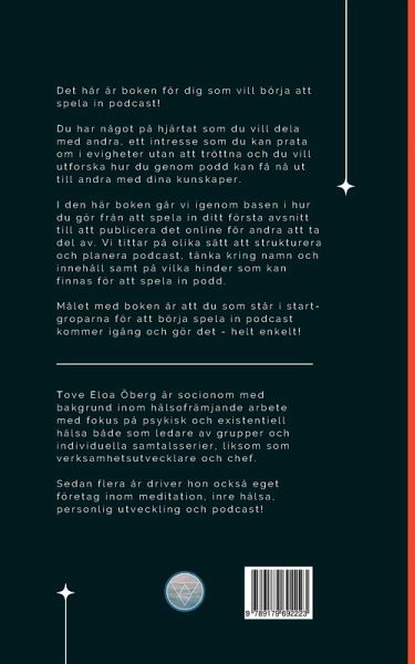 Det här är boken för dig som vill börja att spela in podcast! Du har något på hjärtat som du vill dela med andra, ett intresse som du kan prata om i evigheter utan att tröttna och du vill utforska hur du genom podd kan få nå ut till andra med dina kunskaper. I den här boken går vi igenom basen i hur du gör från att spela in ditt första avsnitt till att publicera det online för andra att ta del av. Vi tittar på olika sätt att strukturera och planera podcast, tänka kring namn och innehåll. Vi tittar också på vilka hinder som kan finnas för att spela in podd, så som rädslor, perfektionism, och prokrastinering. Målet med boken är att du som står i startgroparna för att börja spela in podcast kommer igång och gör det - helt enkelt!