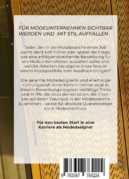 Starte dein Modekarriere, indem du eine Bewerbung mit Wow-Effekt kreierst. Mithilfe dieses Bewerbungsratgebers erstellst du eine aussagekräftige Kreativbewerbung ohne Standardfloskeln und zeigst, was in dir steckt. Außerdem bekommst du durch das Buch einen Leitfaden an die Hand, wie ein überzeugendes Modeportfolio aufgebaut wird. Ebenso verrät dir die gelernte Modedesignerin und ehemalige Führungskraft, was dich in einem Vorstellungsgespräch erwartet und welche weiteren Berufsgruppen dir die Möglichkeit bieten in die Modebranche einzusteigen. Seit 2014 berät die Autorin Jungdesigner über ihre Onlineplattform www.modekarriere.com.Dieser Ratgeber gibt dir einen Einblick, wie ein Chef oder Personaler eines Modeunternehmens denkt und was von einem Bewerber erwartet wird. Die Branche ist oftmals undurchsichtig und das führt in einer Bewerbung immer noch schnell zu Missverständnissen, die in einer Absage enden. Zielführende Aufgaben im Buch sollen dir dabei helfen, dich strukturiert vorzubereiten.
