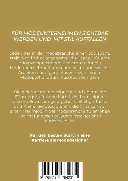 Starte dein Modekarriere, indem du eine Bewerbung mit Wow-Effekt kreierst. Mithilfe dieses Bewerbungsratgebers erstellst du eine aussagekräftige Kreativbewerbung ohne Standardfloskeln und zeigst, was in dir steckt. Außerdem bekommst du durch das Buch einen Leitfaden an die Hand, wie ein überzeugendes Modeportfolio aufgebaut wird. Ebenso verrät dir die gelernte Modedesignerin und ehemalige Führungskraft, was dich in einem Vorstellungsgespräch erwartet und welche weiteren Berufsgruppen dir die Möglichkeit bieten in die Modebranche einzusteigen. Seit 2014 berät die Autorin Jungdesigner über ihre Onlineplattform www.modekarriere.com.Dieser Ratgeber gibt dir einen Einblick, wie ein Chef oder Personaler eines Modeunternehmens denkt und was von einem Bewerber erwartet wird. Die Branche ist oftmals undurchsichtig und das führt in einer Bewerbung immer noch schnell zu Missverständnissen, die in einer Absage enden. Zielführende Aufgaben im Buch sollen dir dabei helfen, dich strukturiert vorzubereiten.