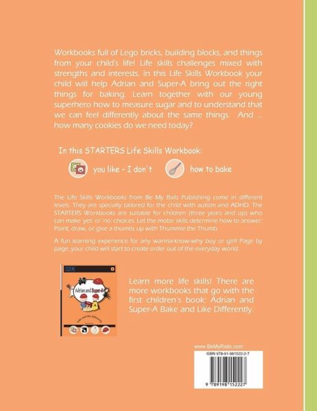 The Adrian and Super-A Life Skills Workbooks are full of Lego bricks, building blocks, and things from your child's life! Find Life skills challenges mixed with a child's strengths and interests. In this STARTERS Workbook your child will help Adrian and Super-A bring out the right things for baking. Learn together with our young superhero how to measure sugar and to understand that we can feel differently about the same things. And ... how many cookies do we need today? The colorful everyday situations and familiar book characters will engage any wanna-know-why boy or girl! For more fun learning, cut out the small memory game and Raily the Train with his pictograms! The workbooks are specially tailored for the children with autism and ADHD, as well as their strengths and difficulties. The exercises will help develop your child's executive functions and theory of mind by teaching even a young child to think in steps and understand how others feel. Parents as well as kindergarten or special education teachers can use the STARTERS Workbooks for children three years and up. The SMARTIES Workbooks are suitable for children who can grasp multiple choices at once. Let the motor skills determine how to answer: Point, draw, or give a thumbs up with Thummie the Thumb. This workbooks builds on the life skills from the book Adrian and Super-A Bake and Like Differently.