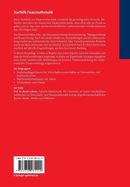 Das Kernstück bilden Zins- und Zinseszinsrechnung, Rentenrechnung, Tilgungsrechnung und Kursrechnung. Auch verwandte Gebiete wie Abschreibungen und Investitionsrechnung werden aus mathematischer Sicht behandelt. Eine Vielzahl praktischer Beispiele macht das Buch interessant und anschaulich. Komplettiert wird der Band durch einen Ausblick auf aktuelle Fragestellungen aus Investment Banking und Portfoliomanagement.