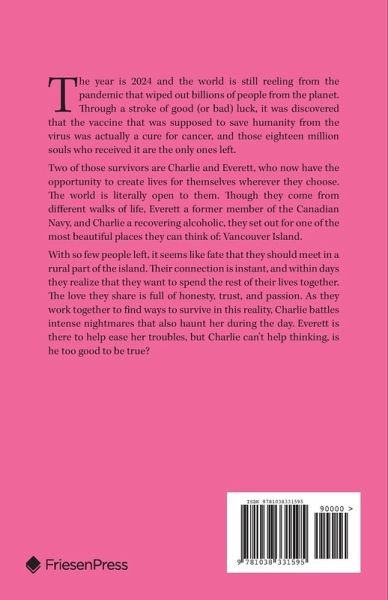The year is 2024 and the world is still reeling from the pandemic that wiped out billions of people from the planet. Through a stroke of good (or bad) luck, it was discovered that the vaccine that was supposed to save humanity from the virus was actually a cure for cancer, and those eighteen million souls who received it are the only ones left. Two of those survivors are Charlie and Everett, who now have the opportunity to create lives for themselves wherever they choose. The world is literally open to them. Though they come from different walks of life, Everett a former member of the Canadian Navy, and Charlie a recovering alcoholic, they set out for one of the most beautiful places they can think of: Vancouver Island. With so few people left, it seems like fate that they should meet in a rural part of the island. Their connection is instant, and within days they realize that they want to spend the rest of their lives together. The love they share is full of honesty, trust, and passion. As they work together to find ways to survive in this reality, Charlie battles intense nightmares that also haunt her during the day. Everett is there to help ease her troubles, but Charlie can't help thinking, is he too good to be true?