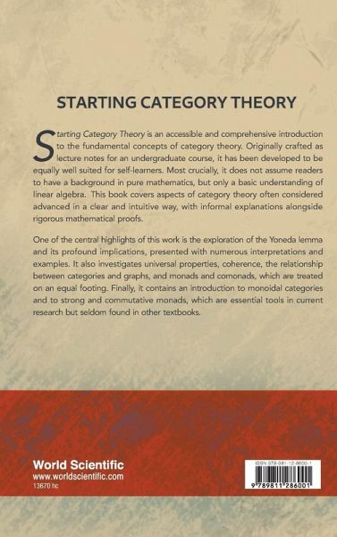 One of the central highlights of this work is the exploration of the Yoneda lemma and its profound implications, during which intuitive explanations are provided, as well as detailed proofs, and specific examples. This book covers aspects of category theory often considered advanced in a clear and intuitive way, with rigorous mathematical proofs. It investigates universal properties, coherence, the relationship between categories and graphs, and treats monads and comonads on an equal footing, providing theorems, interpretations and concrete examples. Finally, this text contains an introduction to monoidal categories and to strong and commutative monads, which are essential tools in current research but seldom found in other textbooks. Starting Category Theory serves as an accessible and comprehensive introduction to the fundamental concepts of category theory. Originally crafted as lecture notes for an undergraduate course, it has been developed to be equally well-suited for individuals pursuing self-study. Most crucially, it deliberately caters to those who are new to category theory, not requiring readers to have a background in pure mathematics, but only a basic understanding of linear algebra.