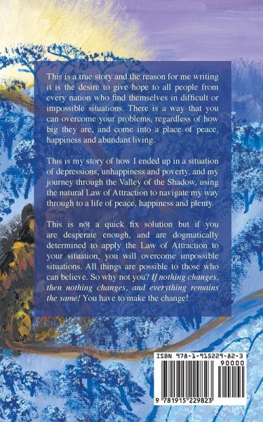 This is a true story and the reason for me writing it is the desire to give hope to all people from every nation who find themselves in difficult or impossible situations. There is a way that you can overcome your problems, regardless of how big they are, and come into a place of peace, happiness and abundant living. This is my story of how I ended up in a situation of depressions, unhappiness and poverty, and my journey through the Valley of the Shadow, using the natural Law of Attraction to navigate my way through to a life of peace, happiness and plenty. This is not a quick fix solution but if you are desperate enough, and are dogmatically determined to apply the Law of Attraction to your situation, you will overcome impossible situations. All things are possible to those who can believe. So why not you? If nothing changes, then nothing changes, and everything remains the same! You have to make the change! perate enough, and are dogmatically determined to apply the Law of Attraction to your situation, you will overcome impossible situations. All things are possible to those who can believe. So why not you? If nothing chnages, then nothing chnages, and everything remains the same! You have to make the change!
