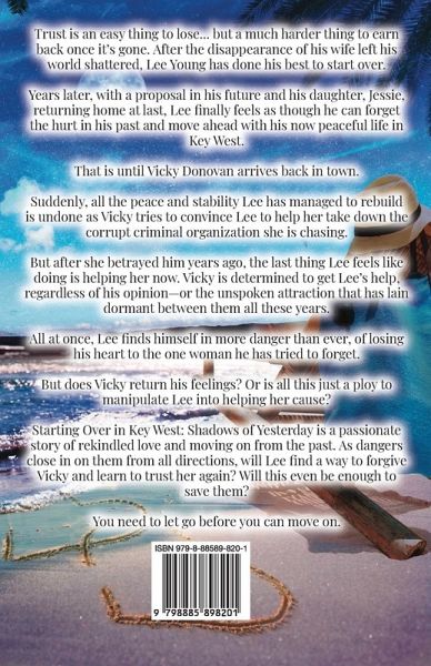 Trust is an easy thing to lose... but a much harder thing to earn back once it's gone. After the disappearance of his wife left his world shattered, Lee Young has done his best to start over. Years later, with a proposal in his future and his daughter, Jessie, returning home at last, Lee finally feels as though he can forget the hurt in his past and move ahead with his now peaceful life in Key West. That is until Vicky Donovan arrives back in town. Suddenly, all the peace and stability Lee has managed to rebuild is undone as Vicky tries to convince Lee to help her take down the corrupt criminal organization she is chasing. But after she betrayed him years ago, the last thing Lee feels like doing is helping her now. Vicky is determined to get Lee's help, regardless of his opinion-or the unspoken attraction that has lain dormant between them all these years. All at once, Lee finds himself in more danger than ever, of losing his heart to the one woman he has tried to forget. But does Vicky return his feelings? Or is all this just a ploy to manipulate Lee into helping her cause? Starting Over in Key West: Shadows of Yesterday is a passionate story of rekindled love and moving on from the past. As dangers close in on them from all directions, will Lee find a way to forgive Vicky and learn to trust her again? Will this even be enough to save them?