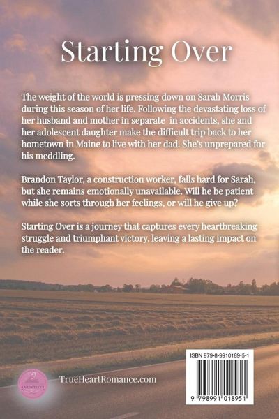 STARTING OVER The weight of the world is pressing down on Sarah Morris during this season of her life. Following the devastating loss of her husband and mother in separate in accidents, she and her adolescent daughter make the difficult trip back to her hometown in Maine to live with her dad. She's unprepared for his meddling. Brandon Taylor, a construction worker, falls hard for Sarah, but she remains emotionally unavailable. Will he be patient while she sorts through her feelings, or will he give up? Starting Over is a journey that captures every heartbreaking struggle and triumphant victory, leaving a lasting impact on the reader.