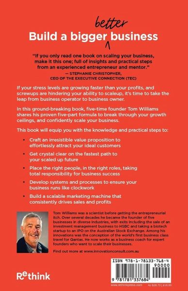 Build a bigger better business If your stress levels are growing faster than your profits, and screwups are hindering your ability to scaleup, it's time to take the leap from business operator to business owner. In this ground-breaking book, five-time founder Tom Williams shares his proven five-part formula to break through your growth ceilings, and confidently scale your business. This book will equip you with the knowledge and practical steps to: Craft an irresistible value proposition to effortlessly attract your ideal customers Get crystal clear on the fastest path to your scaled up future Place the right people, in the right roles, taking total responsibility for business success Develop systems and processes to ensure your business runs like clockwork Build a scalable marketing machine that consistently drives sales and profits