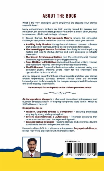 What if the very strategies you're employing are steering your startup toward failure? Many entrepreneurs embark on their journey fueled by passion and innovation, yet countless startups falter-not from a lack of effort, but due to unforeseen pitfalls and strategic missteps. In Beyond Startup, CA Suryaprakash Maurya unveils the concealed challenges and pivotal transitions that can make or break your venture: - Avoiding Early Blunders: Recognize and sidestep common mistakes that plague new startups, setting a solid foundation for success. - The Seven Biggest Reasons for Failure: Gain insights into the primary factors that lead to startup demise and learn strategies to mitigate these risks. - The Unseen Psychological Battles: How the entrepreneurial mindset can be your greatest asset-or your biggest liability. - From $1 Million to $100 Million: Understand the critical shifts in mindset and operations required to scale your business exponentially. - The IPO Moment: Prepare for the transformative process of taking your company public, ensuring you're ready for the challenges and opportunities that come with it. Are you prepared to confront these critical aspects and steer your startup toward unparalleled success? Beyond Startup offers the essential knowledge and tools to navigate the complex entrepreneurial landscape and build a legacy that endures. Your startup's future depends on the choices you make today.