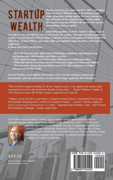 Startup investors are achieving 20%, 40%, and higher rates of return. Whether you’re investing in early-stage companies, raising capital for your startup, or just interested in how angel investors really make their money, Startup Wealth will unravel the mystery surrounding startup capital. STARTUP WEALTH delivers engaging interviews with early- stage investors in Google, Invisalign, ZipCar, Uber, Twilio, Localytics, and other successful and not so successful companies. Find out how an amazing IPO can result in early investors getting pennies on the dollar—or a 10x+ return. Josh Maher profiles 23 of the country’s best investors over the last two decades by way of real-world case studies. Through revealing interviews, readers are introduced to Mark Suster, Catherine Mott, Christopher Mirabile, Brad Feld, Allan May, Joanne Wilson, and many other accomplished angel investors and venture capitalists. In these interviews you’ll learn: • How the best investors think about identifying companies, negotiating terms, and partnering with founders and other investors • How angel investing can involve many different successful approaches • What the best investors have learned from their largest successes and failures • How investors design their portfolios and work with companies to achieve the most successful results. STARTUP WEALTH is an insightful and useful tool for anyone seeking to make better investments, select great investors, or raise early-stage capital for their business. "There is nothing better when it comes to learning ‘best practices’ than hearing from successful people in the trenches. Josh’s book captures the best of the best, as they reveal both what worked and what didn’t for them as angel investors and entrepreneurs. Required reading whatever side of the investing fence you’re on!"—Gerry Langeler, Managing Director at OVP Venture Partners. Co-founder of Mentor Graphics (NASDAQ: MENT). Author of The Success Matrix and Take the Money and Run! An Insider’s Guide to Venture Capital.
