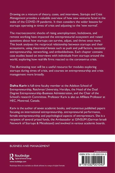 The macroeconomic shocks of rising unemployment, lockdowns, and remote working have impacted the entrepreneurial ecosystem and raised questions about how startups can survive, adjust, and thrive once more. This book analyses the reciprocal relationship between startups and their ecosystems, using theoretical lenses such as push and pull factors, necessity entrepreneurship, networking, and embeddedness. Each chapter contains case studies based on interviews with individuals from startups around the world, exploring how real-life firms reacted to the coronavirus crisis.