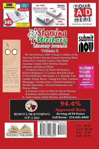 It's the February 2019: Volume 2 edition of the Starving Writers Literary Journal featuring Short Stories by J. Franklin Green, Clint Stutts, Amanda Connor, Ellen Drebin, Dytania Johnson, and Marcus Blake. It features Poetry by Robin McNamara, Juliana Rodriguez, T. Gordon Mayhall, Jason O'Neil Williams, Phil Lester, J. L. Stroede, Tom Geddie, Penny Reyes,, Young Eui Choi, Vandana Bhatnagar, Veronica Free, Trinidad Sanchez Jr., Heather Bansemer, Derwin Emmanuel, and Marcus Blake It Features a One Act Play by David Thomas It features Articles by Joshua Sherman, K. Scott Cooper, Emily Stevens, and Bob Jensen The Starving Writers Journal is edited by Marcus Blake, Jenn Chastka, Camila Gonzalez, Andrew Fallman