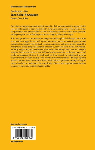 Preface.- Part I: Introduction.- 1 Context, Purpose and Structure of the Book.- 2 State Aid for Newspapers.- Part II: Theories.- 3 State Support for News.- 4 Industrial Subsidies.- 5 Newspaper Subsidies and Journalistic Quality.- 6 State Aid to the Press in the EU.- 7 Press Governance.- Part III: Cases and Actions.- 8 Australia: State Aid to Newspapers.- 9 Austria: Press Subsidies in Search of a New Design.- 10 Belgium: Big Changes in a Small News Economy.- 11 Bulgaria: Press Subsidies in the Shadows.- 12 Finland: The Rise and Fall of a Democratic Subsidy Scheme.- 13 France: Press Subsidies.- 14 Germany: Evaluating Alternatives to Finance Quality Journalism.- 15 Greece: Press Subsidies in Turmoil.- 16 Hungary: The State as Strong Media Governor.- 17 The Netherlands: Initiatives to Subsidize Press Innovation.- 18 Russia: Subsidies Between Industry Support and State Control.- 19 Sweden: State Support to Newspapers in Transition.- 20 Switzerland: The Role of Swiss Post in Indirect Press Support.- 21 United Kingdom: Subsidies and Democratic Deficits in Local News.- 22 United States: American Exceptionalism.- Part IV: Conclusion.- 23 State Aid for Newspapers: A Summary Assessment.