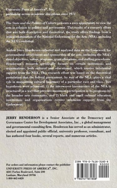The State and the Politics of Culture presents a rare opportunity to view the arts in relationship to politics and government. The results of a research effort that was both descriptive and theoretical, the study offers findings from a critical examination of the National Endowment for the Arts (NEA), including the NEA's evolution.