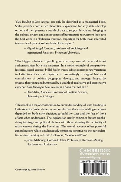 State Building in Latin America explores why some countries in the region developed effective governance, while others did not. The argument focuses on political ideas, economic geography, and public administration to account for the development of public primary education, taxation, and military mobilization in Chile, Colombia, Mexico, and Peru.
