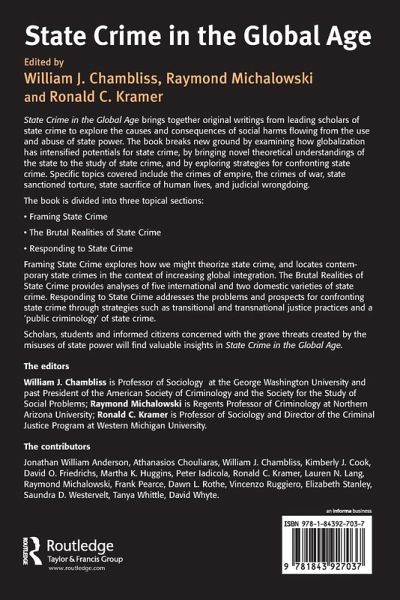State Crime in the Global Age brings together original writings from leading scholars in the field to explore the many ways that the use and abuse of state power results in grave social harms that outweigh, by far, the consequences of ordinary street crime. The topics covered include the crimes of empire, illegal war, the bombing of civilians, state sanctioned torture, state sacrifice of human lives, and judicial wrongdoing. The book breaks new ground through its examination of the ways globalization has intensified potentials for state crime, as well as bringing novel theoretical understandings of the state to the study of state crime, and exploring strategies for confronting state crime. This book, while containing much that is of interest to scholars of state crime, is designed to be accessible to students and others who are concerned with the ways individuals, social groups, and whole nations are victimized by the misuse of state power.