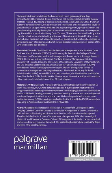 List of Figures List of Tables Acknowledgements List of Contributors Introduction; M.T.Witt & A.P.Kakabadse State Crimes Against Democracy: A Clarification of Connotations; J.Dixon , S.Spehr & J.Burke Normalizing the SCAD Heuristic; C.Hinson From a Fabric of Suspicion: The U.S. Constitution and Other Founding Dilemmas; L.deHaven-Smith Auditing Moral Hazards for the Post-Global Financial Crisis (GFC) Leadership; A.Kakabadse , A.Kouzmin , N.K.Kakabadse & N.Mouraviev Ideal Typing (in)visible Power in the Context of Oligarchic Isomorphisms; A.Kouzmin The Social Construction of Race, Inequality and the Invisible Role of the State; C.Jensen Unlimited & Unchecked Power: The Use of Secret Evidence Law; M.G.Alkadry American Military-Education Convergence: Designing the Failure of Public Education; R.Simnjanovski Privatising Vulnerability: The Downside to Shareholder-Value Maximization; N.K.Kakabadse & A.Kakabadse The Determination of Behavioural Patterns in Tourism Destinations through Terrorism: Lessons from Crete, Greece; N.V.Pappas Cultural Narratives, Early Occupy Movement, and the TEA Party: Are revolts against E-SCAD and SCAD; D.S Kuku-Siemons , J.Johannesson & H.Siemons SCAD Alert: Occupy Wall Street is to Capitalism what Labor Unions were to Communism - a Systemic Contradiction that can be neither Swallowed nor Spit Out; M.Witt Index