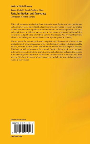 This book presents a set of original and innovative contributions on state, institutions and democracy in the field of political economy. Modern political economy has implied the interaction between politics and economics to understand political, electoral and public issues in different nations, and in this volume a group of leading political economists and political scientists from Europe, America and Asia provides theoretical advances, modelling and case studies on main topics in political economy.