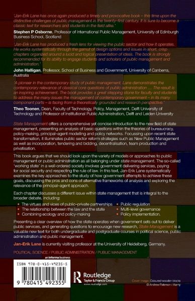State Management offers a comprehensive yet concise introduction to the new field of state management, presenting an analysis of basic questions within the theories of bureaucracy, policy-making, principal-agent modelling and policy networks. Focussing upon recent state transformation, it illuminates public sector reform strategies such as New Public Management as well as incorporation, tendering and bidding, decentralization, team production and privatization. This book argues that we should look upon the variety of models or approaches to public management or public administration as all belonging under "state management". The so-called "working state" in a well-ordered society involves government delivering services, paying for social security and respecting the rule of law. In this text, Jan-Erik Lane systematically examines the key approaches to the study of how government attempts to achieve these goals, discussing the pros and cons of alternative frameworks of analysis. Each chapter discusses a different issue within state management that is integral to the broader debate, including: Public regulation The relationship between the law and the state Combining ecology and policy making Multi-level governance The virtues and vices of public-private partnerships Policy implementation Presenting a clear overview of how the state operates when government sets out to deliver public services, and generating questions to encourage new research, State Management is a valuable new text for both undergraduate and postgraduate courses in political science, public administration and public management.