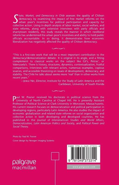 "In State, Market and Democracy in Chile, Posner argues that even in the competitive political environment characterizing the post-authoritarian period, neoliberalism, as a model of economic growth, erodes subaltern groups capacity for collective action. Indeed, he makes the point that the current consolidation of a democratic political regime in Chile rests, at least in part, on the silence of these groups. His focus on the participation and incorporation of the popular sectors in the new democratic institutional arrangements provides a revealing corrective to narrowly institutionalist and procedural interpretations common in much recent work on democracy in Latin America and elsewhere. Comparative chapters on Argentina and Mexico extend Posner s analysis and make this book important to anyone interested in the quality of democracy in Latin America." - William C. Smith, Editor, Latin American Politics and Society and Professor of Political Science, University of Miami