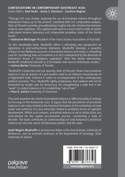 This book examines the theme of privatised violence in different political settings by focusing on the Indonesian case. It argues that the persistence of privatised violence is not solely related to the historical formation of the institutions of state power and authority; it is also intricately related to predatory forms of capitalist development. Within such contexts, privatised violence is not an obstruction, but instrumental for the capital accumulation process, constituting a state of disorder. The book contributes to understanding not only Indonesia's privatised violence but also the nature of Indonesian politics and the state.