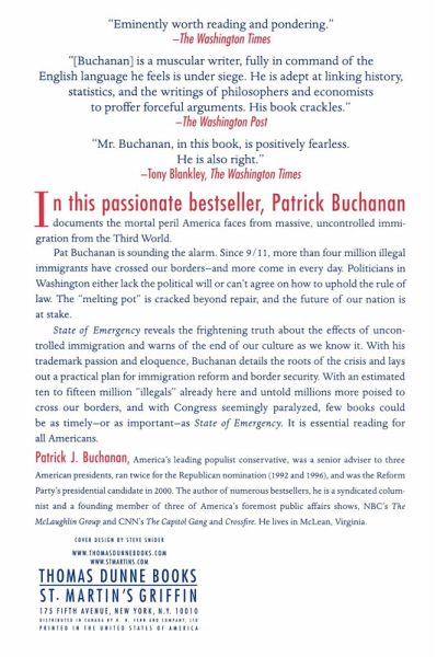 "The one absolutely certain way of bringing this nation to ruin, of preventing all possibility of its continuing to be a nation at all, would be to permit it to become a tangle of squabbling nationalities," said Theodore Roosevelt. State of Emergency will demonstrate that this is exactly what is happening to America and may now be unstoppable. The United States of 1960 was a First World nation, 90% of whose people traced their ancestry to Europe, 97% of whom spoke English. We studied the same history and literature in school, went to the same movies, read the same books, listened to the same radio and TV, cherished the same heroes. We were one nation and one people. That America is dead and gone. The deconstruction of America -- along the lines of culture and values, language and faith, allegiance and loyalty -- has begun. By 2050, Americans of European descent will be a minority in the United States. One hundred million Hispanics with ties of language and loyalty to Mexico and Latin America will be living here, concentrated in the Southwest It is the thesis of State of Emergency that the Melting Pot is broken beyond repair, that assimilation and Americanization are not taking place, and that only action is to seal and secure America's borders to halt the flow of over a million legal and illegal immigrants a year, and to begin the Americanization of the tens of millions of aliens in our midst can save America. Our civilization cannot survive indefinitely what is going on. State of Emergency reveals who is doing this to us, why they are doing it, why this is our last chance, and how, if the will is there, we can yet save America from Balkanization and break-up.