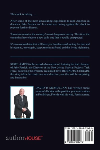The clock is ticking...... After some of the most devastating explosions to rock America in decades, Jake Patrick and his team are racing against the clock to prevent further disaster. Terrorism remains the country's most dangerous enemy. This time the extremists have chosen a new path, one that is totally unexpected. It's an emotional ride that will leave you breathless and rooting for Jake and his team to, once again, keep America safe and end this living nightmare. -------------------- STATE of MIND is the second adventure novel featuring the lead character of Jake Patrick, the Director of the New Jersey Special Projects Task Force. Following the critically acclaimed novel BEHIND the CURTAIN, this story takes the reader in a new direction, one that will be surprising and innovative.